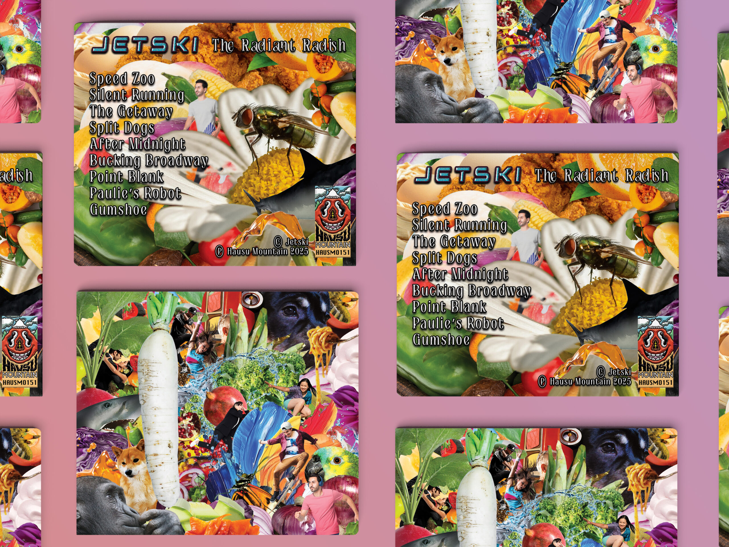 Peoria, IL-based producer Ian Ostaszewski makes music under the name Jetski. His gonzo sample-based output manifests as overwhelming plunderphonic collages of juxtaposed sounds charged by complex webs of overlapping rhythms and head-spinning shifts in mood and timbre, all meticulously laid out to the point that it feels like you’re hearing a live band burn through a set of hyper-progressive music. The Radiant Radish, his first album on Hausu Mountain, follows his debut Reflex Engine (released on HausMo satellite label Blorpus Editions in 2022) with an awe-inspiring song cycle of freewheeling sample assemblage. He injects numerous fragments drawn from royalty-free sound libraries and public domain films – by his estimation somewhere between 4000 and 4500 samples – into composite takes that jitter with constant activity, performed live on his network of samplers running on iPads and iPhones. For all of his album’s ballistic sample-churning pandemonium, Jetski surprises us more with the sophistication and dream-logic organization of his arrangements rather than their disarray. With his relatively anonymous sources providing the constituent parts of The Radiant Radish, the album draws its manic power not from the potential of listeners pinpointing the origins of sounds or contextualizing them along a cultural timeline, but from the mind-bending narrative and morphing rhythmic reality of Jetski’s collages themselves on a moment-to-moment basis. We recognize the tones of individual instruments but can’t determine exactly what they’re playing as they crash into the mix in a disfigured fashion for a few seconds, just as we come to trace brief passages of rhythm made from staccato samples that speed by too fast to even attempt to identify. Before long, we give up trying to pick out anything at all and let Jetski’s tidal wave of sounds wash over us.