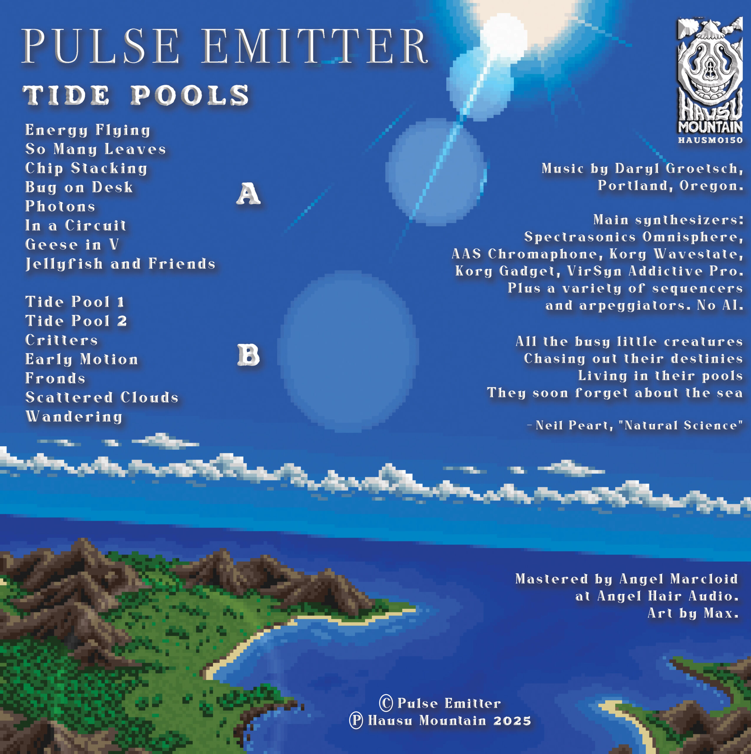 Portland based producer / synthesist Daryl Groetsch composes music under the moniker Pulse Emitter. Channeling his love and mastery of styles ranging from new age to Berlin school kosmische to drone to progressive electronic music to noise akin to junk floating through deep space, Groetsch crafts emotionally resonant synth pieces teeming with diverse melodic architectures and textural details. A mainstay of the American experimental underground for over two decades, he has released dozens of albums of his exploratory and ever-evolving output as Pulse Emitter which have appeared on labels including Aguirre Records, Constellation Tatsu, and NNA tapes, while self-releasing music under his given name and as his dungeon synth side project Endless Fog. Tide Pools, Groetsch’s new LP on Hausu Mountain, follows the relatively more languid ambient strains of his work found on Swirlings (HAUSMO92 – 2020) and Dusk (HAUSMO128 – 2022) with a dizzying excursion into kinetic rhythms and fast-morphing song structures. Groetsch himself describes the album as an attempt “to explore the deep emotions possible from jazz harmony, manifest the rhythmic complexity always chattering around in my head, and push my music somewhere I haven’t.”