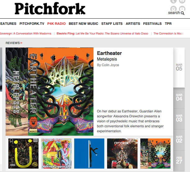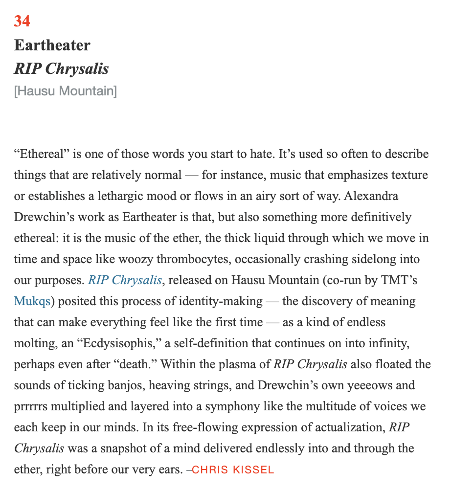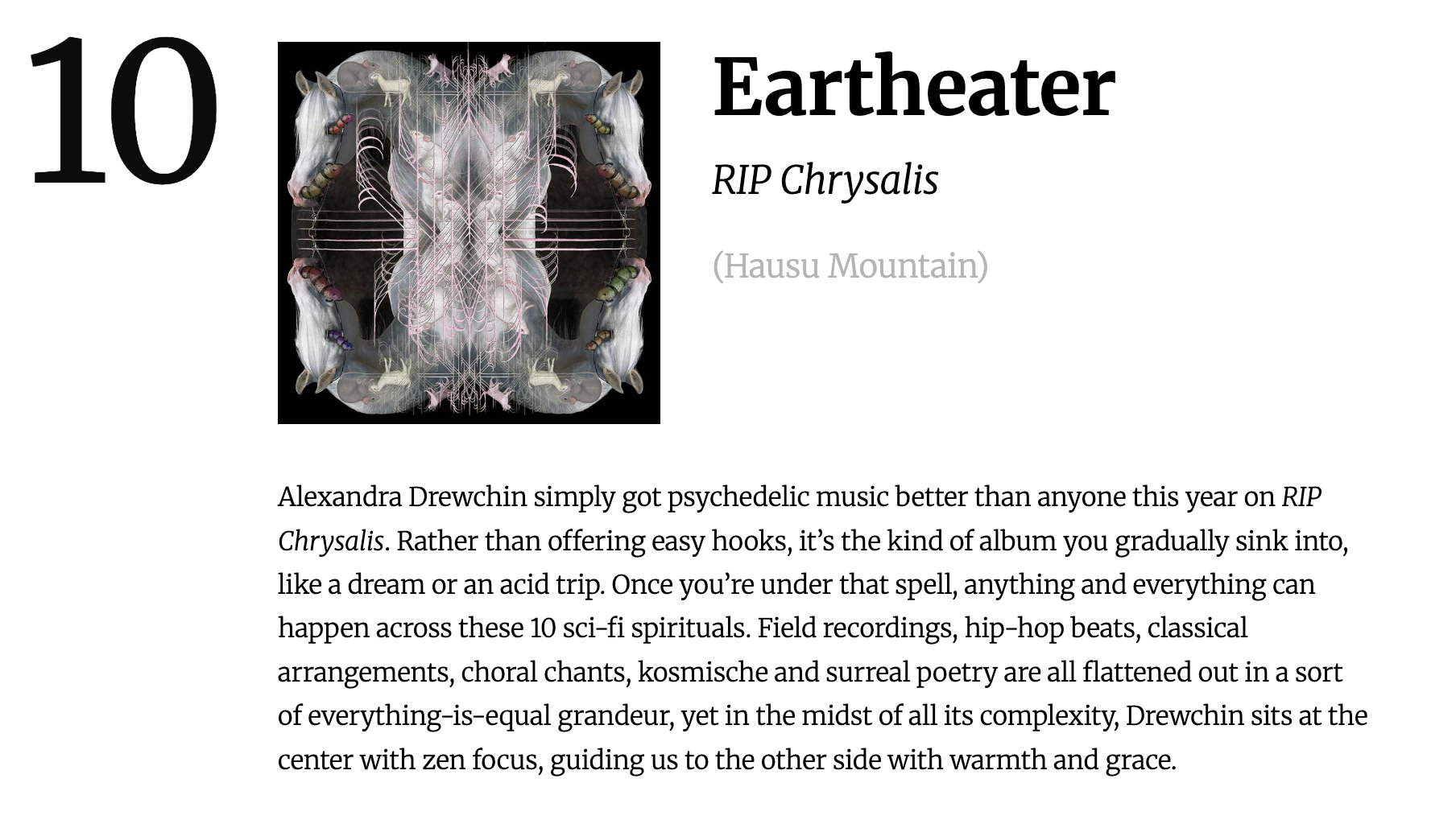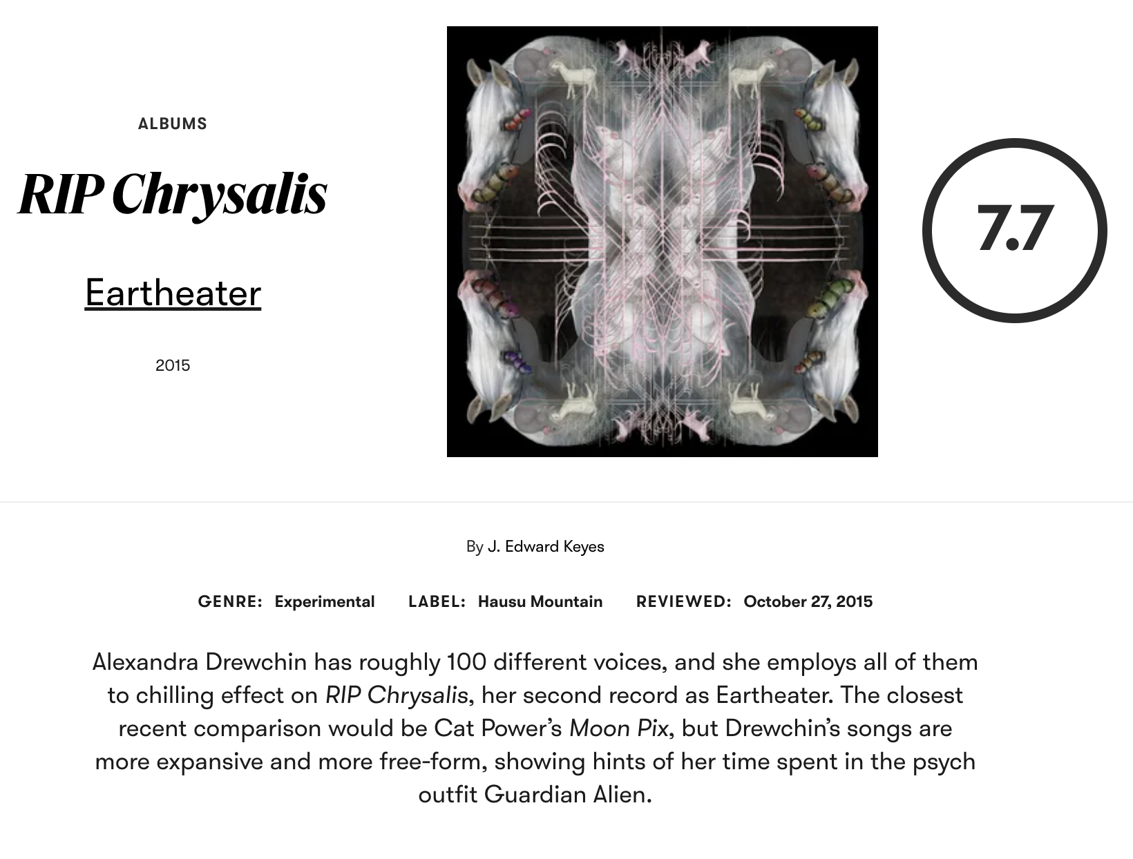 Though at first glance the music Eartheater went on to release on PAN Records and her own imprint Chemical X pushed her sound into more overtly electronic-driven territories animated by modern sound design (as on 2018’s IRISIRI and 2022’s Trinity) or dynamic arrangements for orchestral and acoustic instruments (as on 2020’s Phoenix: Flames Are Dew Upon My Skin and 2023’s Powders), in truth these elements of her subsequent work are all present in Metalepsis and RIP Chrysalis in embryonic forms. Though the albums foreground Drewchin’s voice and her guitar performances to present her songwriting in the idiom of stripped-down bedroom pop, her instincts as an electronic producer and an arranger of disparate sounds elevate her music to the level of the auteur in full command of her complex compositions. Alongside the moments in which she zooms straight into the details of her cascading vocal lines and delicate fingerpicked guitar progressions, we get passages of electro-acoustic collage that diverge from traditional song formats into the realm of free-form abstraction: fragmentary samples that scroll by like a radio dial spinning through stations; bursts of corrupted glitch synth planted alongside violins and 808 kicks; extended expanses of drone that dispense with harmony in favor of pure texture. For as much variation as Eartheater’s production offers on Metalepsis and RIP Chrysalis, the constant evolution of her vocal melodies remains at the core of her project. She winds her way through a labyrinth of tumbling melodic figures that range from tongue-twisting mid-range cadences to bursts of color in the highest of falsettos. She tries on hard-effected belting closer to 90s alternative rock, layered wordless coos and chirping vocalizations, and pensive spoken-word whispers. Her lyrics toy with themes of humanity’s increasing integration with technology, with our tiny role and self-perception in a vast universe, with the joys and dissociations inherent to sex and subsistence, and with the boundaries between the imagined dreamworld and the (u)(dys)topia expanding before us.
