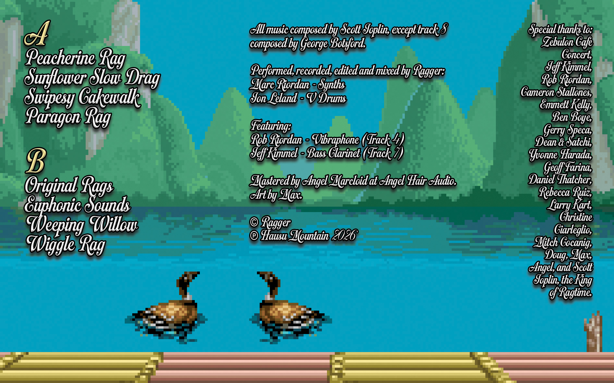 While Hausu Mountain has always highlighted an interest in “carnivalesque” music, from the gonzo cyborg experiments of Wobbly to the sideshow psychedelia of Mondo Lava to the tongue-in-cheek freneticism of Jetski’s sample collages, Ragger’s Euphonic Sounds sets the carnival trapeze higher than anything else in the label’s catalog, while also honoring HausMo’s abiding love for 16-bit video game sounds and imagery. For label heads Doug Kaplan and Max Allison, Ragger’s own elevator pitch for their music as “Scott Joplin in Super Mario World” seemed too good to be true on paper – somehow too dialed into the label’s aesthetics to ever land successfully in practice. But guess what? Riordan and Leland nailed it. Euphonic Sounds overflows with whimsy and joy as much as a brand of casual virtuosity in service of the intricacies of music composed over a century ago. While ragtime might nominally be catalogued closer to “classical music” by today’s listeners, its deep roots weave into the origins of jazz, blues, pop, and dance music. We hear Ragger tease these threads out while transplanting the style into modern tones and ideas from the perspective of the avant-underground, attesting to the passion that the duo has for this music and the lengths they were willing to stretch themselves both mentally and physically to perform it at this level.